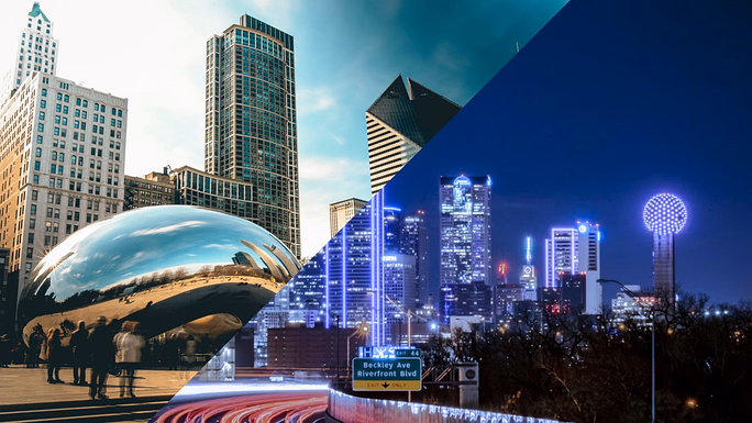 Chicago Bean at Millinium Park and a nighttime view of Dallas.